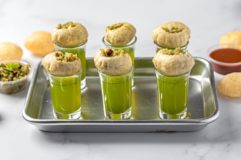 Puffed wafers stuffed with chickpeas, potato; served with flavored water
